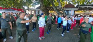 Melonguane – Talaud, Mayjen TNI Legowo W. R. Jatmiko, S.I.P., M.M. Pangdam XIII/Merdeka bersama Ny Nonny Legowo W.R. Jatmiko Ketua Persit KCK PD XIII/Merdeka,Wakil Bupati Kabupaten Kepulauan Talaud Drs. Moktar Arunde Parapaga, Jajaran Forkopimda laksanakan Olahraga bersama serta Bakti Sosial di Pantai Melonguane, Selasa (05/12/23).