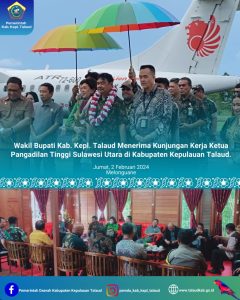 Kedatangan Ketua Pengadilan Tinggi Sulawesi Utara bersama rombongan di Kabupaten Kepulauan Talaud di sambut secara adat. Sesuai dengan agenda kerja Ketua Pengadilan Tinggi di Kabupaten Kepulauan Talaud, melaksanakan Pembinaan dan Pengawasan Kerja di Pengadilan Tinggi Melonguane dan Meresmikan lapangan tenis Pengadilan Negeri Melonguane pada hari Sabtu.