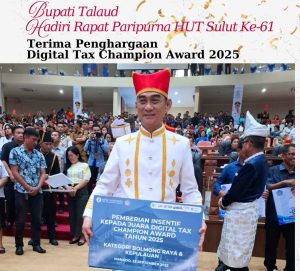 Penghargaan ini diberikan kepada Pemerintah Kabupaten Kepulauan Talaud yang telah menunjukan kinerja terbaik pembayaran pajak daerah secara digital atau non tunai. Keberhasilan ini mencerminkan komitmen kuat Pemkab Talaud dalam memanfaatkan teknologi untuk meningkatkan efisiensi, transparansi, dan pengelolaan pajak daerah yang lebih baik.