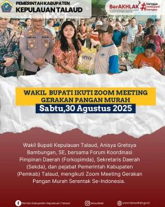 Wakil Bupati Kepulauan Talaud, Anisya Gretsya Bambungan, SE, bersama Forum Koordinasi Pimpinan Daerah (Forkopimda), Sekretaris Daerah (Sekda), dan pejabat Pemerintah Kabupaten (Pemkab) Talaud, mengikuti Zoom Meeting Gerakan Pangan Murah Serentak Se-Indonesia. Acara yang dipusatkan di Pantai Indah Melonguane ini berlangsung pada Sabtu (30/8/2025).