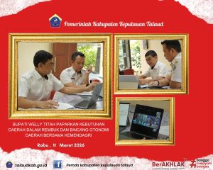Bupati Kepulauan Talaud Welly Titah mengikuti kegiatan Rembuk dan Bincang Otonomi Daerah antar Kepala Daerah dan Kementerian Dalam Negeri secara daring didampingi Sekretaris Daerah, Rabu (11/3/2026), kegiatan ini diselenggarakan oleh Dirjen Otonomi Daerah yang bertujuan untuk mempertemukan para kepala daerah untuk membahas berbagai persoalan dan tantangan pembangunan di daerah.